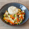 « Kaeng Ped » votre choix de protéine sautée avec la sauce au curry rouge du chef, du lait de coco, des courgettes, des oignons, des poivrons et du basilic Thaï servi avec du riz blanc.